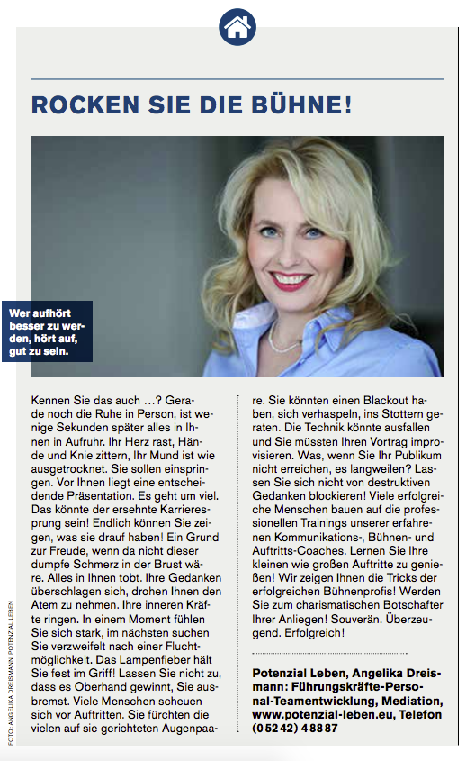 Kennen Sie das auch …? Gerade noch die Ruhe in Person, ist wenige Sekunden später alles in Ihnen in Aufruhr. Ihr Herz rast, Hände und Knie zittern, Ihr Mund ist wie ausgetrocknet. Sie sollen einspringen. Vor Ihnen liegt eine entscheidende Präsentation. Es geht um viel. Das könnte der ersehnte Karrieresprung sein! Endlich können Sie zeigen, was sie drauf haben! Ein Grund zur Freude, wenn da nicht dieser dumpfe Schmerz in der Brust wäre. Alles in Ihnen tobt. Ihre Gedanken überschlagen sich, drohen Ihnen den Atem zu nehmen. Ihre inneren Kräfte ringen. In einem Moment fühlen Sie sich stark, im nächsten suchen Sie verzweifelt nach einer Fluchtmöglichkeit. Das Lampenfieber hält Sie fest im Griff! Lassen Sie nicht zu, dass es Oberhand gewinnt, Sie ausbremst. Viele Menschen scheuen sich vor Auftritten. Sie fürchten die vielen auf sie gerichteten Augenpaare. Sie könnten einen Blackout haben, sich verhaspeln, ins Stottern geraten. Die Technik könnte ausfallen und Sie müssten Ihren Vortrag improvisieren. Was, wenn Sie Ihr Publikum nicht erreichen, es langweilen? Lassen Sie sich nicht von destruktiven Gedanken blockieren! Viele erfolgreiche Menschen bauen auf die professionellen Trainings unserer erfahrenen Kommunikations-, Bühnen- und Auftritts-Coaches. Lernen Sie Ihre kleinen wie großen Auftritte zu genießen! Wir zeigen Ihnen die Tricks der erfolgreichen Bühnenprofis! Werden Sie zum charismatischen Botschafter Ihrer Anliegen! Souverän. Überzeugend. Erfolgreich! {Gütsel, Nov 2018}